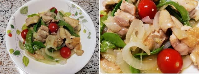 鶏肉と新玉ねぎと絹さやとミニトマトを
