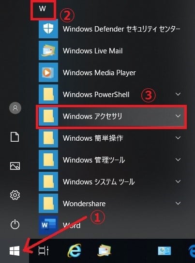 1. Windows10をお使いの方は、左下のスタートボタンをクリックして、「W」という文字を探してください。